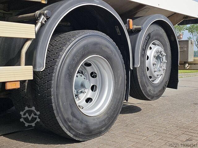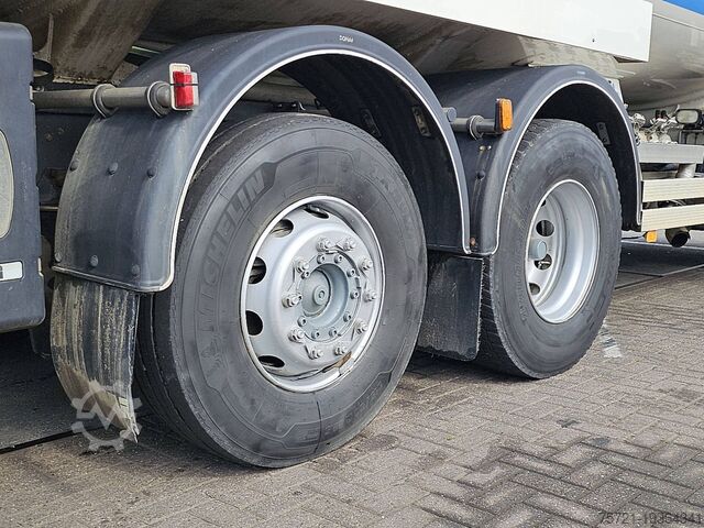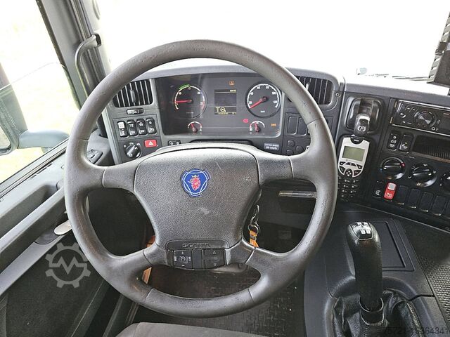 Number of axles: 3, configuration: 6x2, twin tires, unladen weight: 10,085 kg, gross weight: 26,000 kg, total tank capacity: 300 liters, fifth wheel coupling: Fixed, number of locks: 1, suspension type: air suspension, type of cab: short cab, cruise control, tachograph (control device), digital tachograph, electric windows, electric mirrors, color: white, heated mirrors, reversing camera, lighting type: halogen lamp, speed limiter, fuel: diesel, Euro: 5, transmission type: manual, transmission model: Scania, speed limiter, gears: 8, clutch pedal, power steering, ABS, ASR, power take-off, PTO type: 1, starter battery, central locking, seat configuration: 1+1, seat material: fabric, seat adjustment: manual
