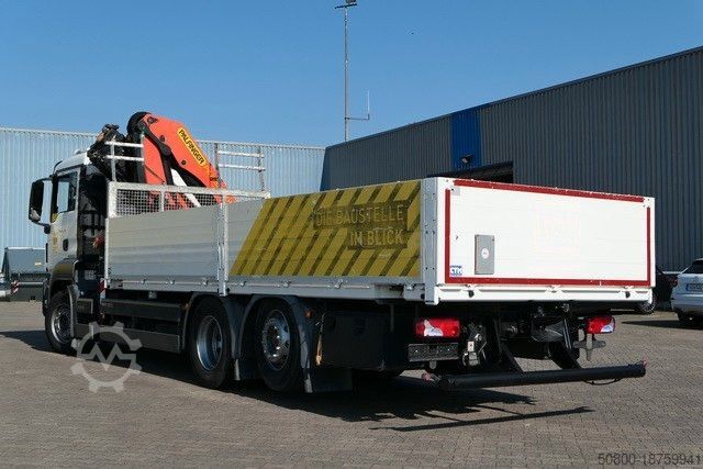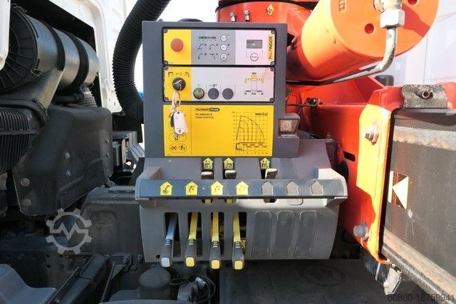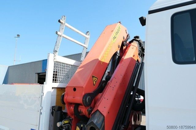 Бортовой кузов, алюминиевые боковые стенки, 2-секционные, 800 мм, пол с трафаретной печатью, сквозные крепежные отверстия во внешней раме, средний кран PALFINGER, тип: PK 22002-EH D, 2-сторонняя гидравлическая опора. выдвижной и поддерживающий, 5-ступенчатый гидравлический. выдвижной, макс. грузоподъемность 5700 кг, схема: прибл. 4,5 м - 4450 кг, 6,5 м - 2850 кг, 8,5 м - 2050 кг, 10,5 м - 15870 кг, 12,8 м - 1260 кг, 15,0 м - 1080 кг, пружинное кольцо для буксировочного крюка, тормозное соединение Duo-Matic, помощник экстренного торможения, помощник удержания в полосе, помощник контроля устойчивости, ABS, ASR, блокировка дифференциала заднего моста, моторный тормоз, помощь при трогании с места, круиз-контроль, автоматический климат-контроль, многофункциональное рулевое колесо, наружные зеркала заднего вида с подогревом и электроприводом. регулируемые, электрические стеклоподъемники для дверей водителя и пассажира, сиденье водителя с комфортной подвеской, люк в крыше, пневматические гудки на крыше кабины водителя, пневматическая подвеска с подъемно-опускным устройством передней и задней осей, самоуправляемая подъемная ось, транспортное средство может быть покрыто рекламой и/или наклеено