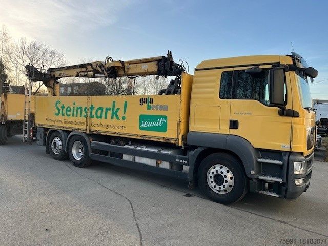 Very well-maintained MAN TGS 26.400 construction materials truck with Atlas 220.2 loading crane and pallet tongs