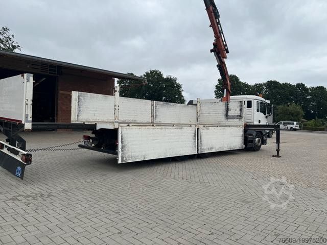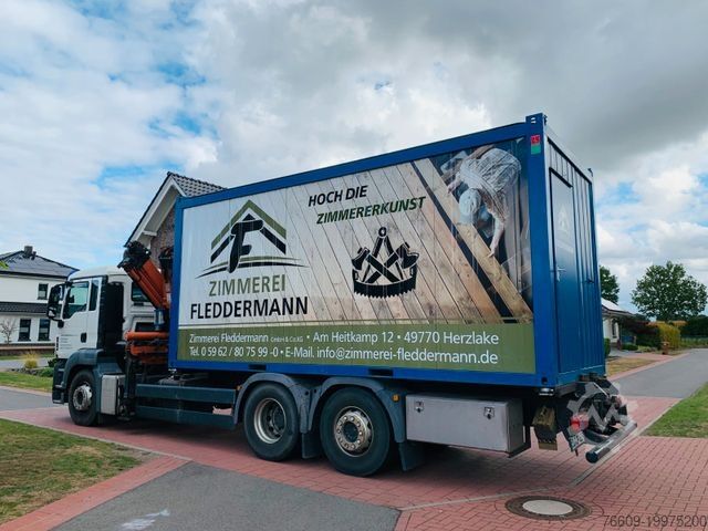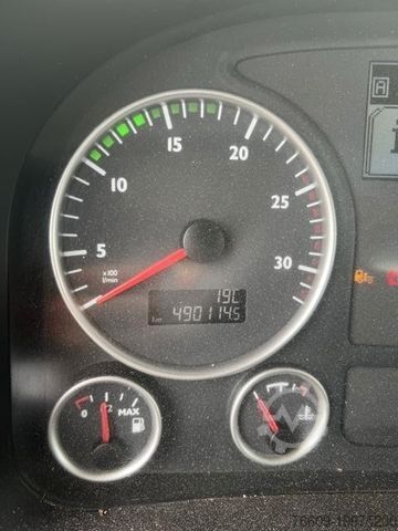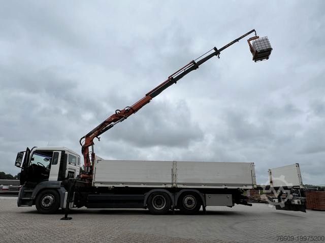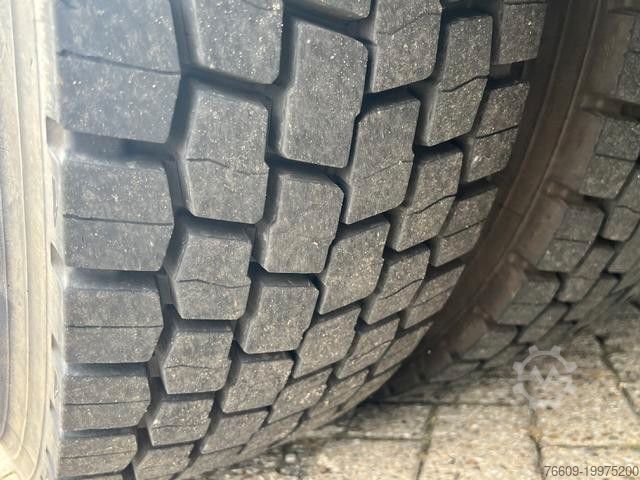 Additional features: good condition / fully functional, flatbed/BDF body length = 5853 mm, support legs present, low noise, second-hand, remote control for crane operation, radio CD, lift axle, steering axle, seat heating, electric windows, sun visor, on-board computer, toolbox, disc brakes, German registration, differential lock, comfort suspension seat, green environmental badge, digital tachograph, electric windows and mirrors, rotation servo / stone grab, lashing holes in the outer frame / Multilock outer frame for load securing, tires / double wheels as new!