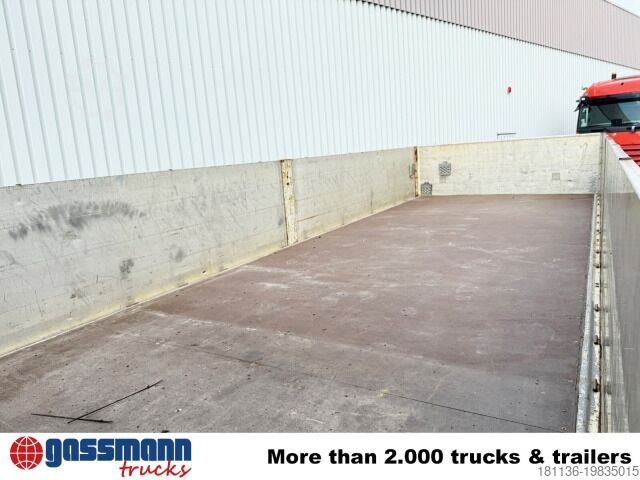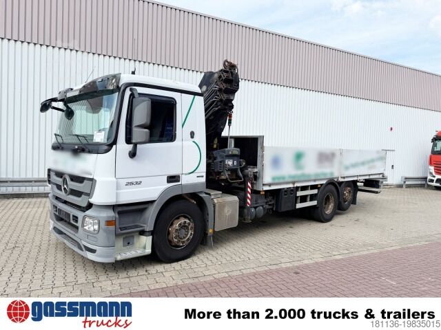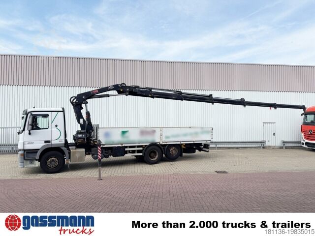 Body: Flatbed body with aluminum sideboards & Hiab 244EP-5 HiDuo crane with remote control. 8t front axle, H6 13t rear axle with 440 crown gear, 7.5t liftable trailing axle, disc brakes on front and rear axle, Telligent brake system with ABS and ASR, front underrun protection, additional stabilizer on rear/trailing axle, start assist, PSM, pre-wiring for toll system, distribution cockpit, Mercedes PowerShift, pollen filter, on-board diagnostics 2, transmission oil cooler, PTO intermediate shaft MB 131-2c.