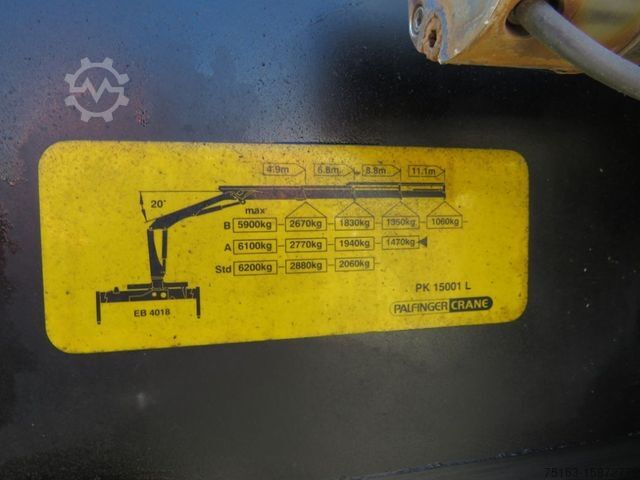 ----Special structure: Crane: Palfinger PK 15001L, radio remote control, fully hydraulic support, 6th + 7th control circuit for rotary servo and stone grab operation. Load diagram read: Lifts at 4.9m-2.77t, 6.8m-1.94t, 8.8m-1.47t.----Construction: Building material platform, raised front wall, aluminum floor, lashing eyes, foldable center stanchion, Kinnegrip fasteners.