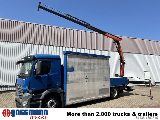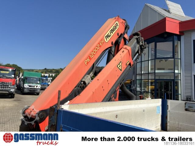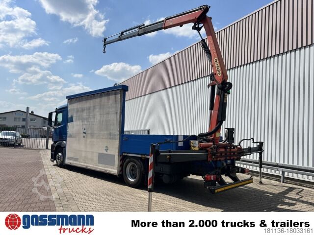 Wheelbase: 5500 mm Body: HEGLA glass transport rack with sliding tarpaulin, flatbed with aluminum drop sides & rear crane Palfinger PK 12002-EH B with radio control (remote control) Front axle air-sprung, 8t front axle, rear axle disc wheel 440 Hypoid 13t, EBS with ABS and ASR, disc brakes on VA and HA, condensation water monitoring for compressed air system, additional rear axle stabilizer, front underride guard made of aluminum, Smoker package, residual heat utilization, hot water auxiliary heating, PSM, ClassicSpace, comfort locking system, economy drive program, Mercedes PowerShift 3, pre-installation for toll collection, LED daytime running lights, cornering lights, High Performance Engine Brake, ESP, Lane Keeping Assist, Attention Assist, Active Brake Assist, transmission lock for auxiliary drive, auxiliary drive MB 131-2c pump.