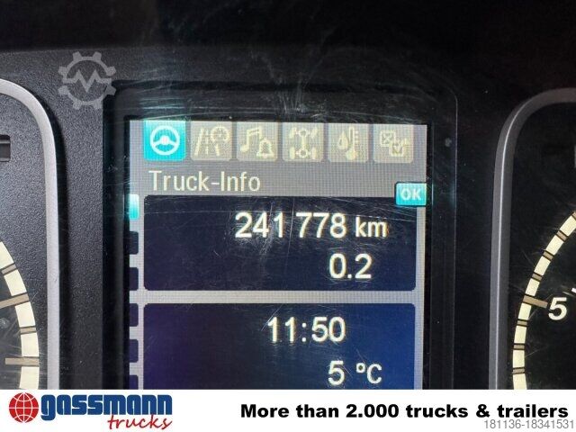 Vehicle location: Bovenden, ClassicSpace, Active Brake Assist, Mercedes PowerShift 3, Kz. Haus, 1x comfort seat, heated seats, electric mirror, heated mirror, electric window left, electric window right, air conditioning, sun visor, cruise control, ABS (anti-lock braking system), traction control (ASR), constant throttle, roof spoiler, frame paneling, differential lock, fog lights, fire extinguisher box, leaf air suspension, tarpaulin and bows, tow bar air+light, low noise G1, lashing eyes, U-protection, roof hatch, aluminum tail lift, standing, green environmental badge