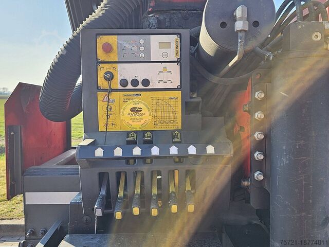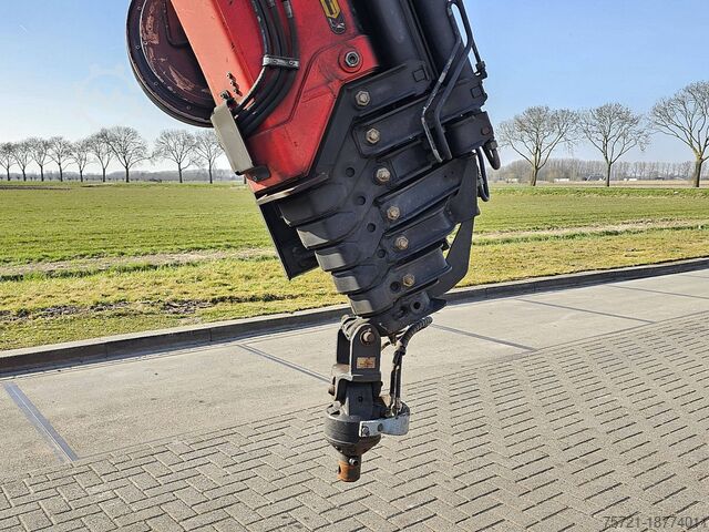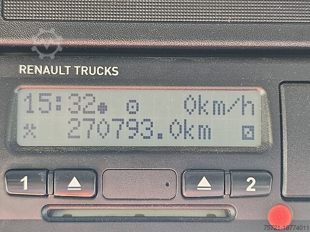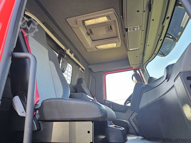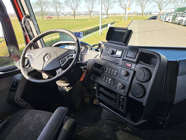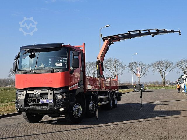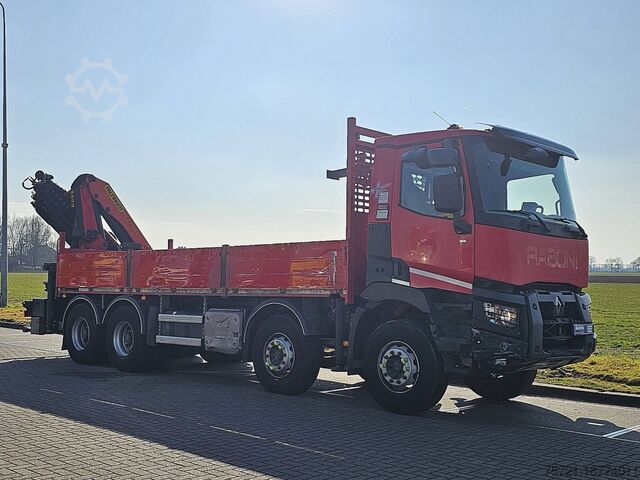 Number of axles: 4, configuration: 8x4, unladen weight: 17,585 kg, gross weight: 37,000 kg, total fuel tank capacity: 350 liters, number of differential locks: 2, suspension type: leaf spring suspension, cab type: short cab, cruise control, tachograph (control device), digital tachograph, air conditioning, color: red, engine manufacturer: Renault, engine output: 323 kW (433 hp), Euro standard: 6, transmission type: Optidriver, gears: 12, power steering, ABS, ASR, power take-off (PTO), PTO type: 1, pump, crane, crane manufacturer: PALFINGER 27001 EH, year of crane manufacture: 2017, crane capacity: 27, maximum load: 830 kg at 18.7 m, number of stabilizers: 4, CE certified, control position: right-hand side operation, remote control, crane position: at the rear, extendable: 7, hydraulic auxiliary connections: 2, rotator, pallet hook, load hook, stone clamp, PALFINGER PK 27000-7