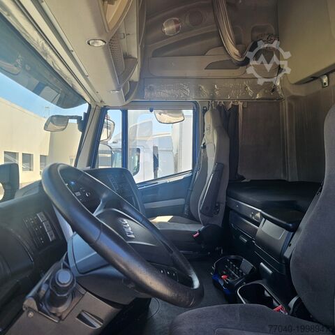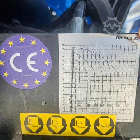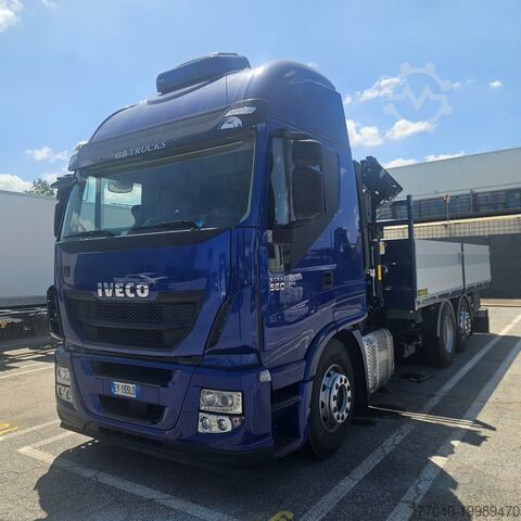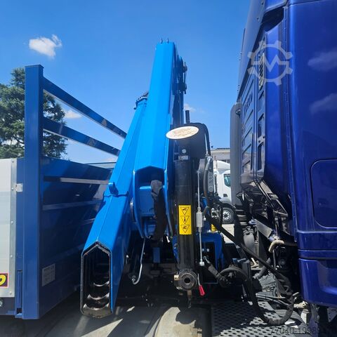 Hi Way cab with air suspension, metallic blue. Cursor 13 engine, 560 hp, Euro 6 emission standard, Eurotronic gearbox, 12 speeds, ZF Intarder, navigation system, refrigerator, stationary air conditioning, wheelbase 4200 mm, year of registration: 04/2016, mileage: 816,107 km, DN Cranes 24000 crane, 5 extensions with radio remote control, fixed flatbed 5,200 mm with TR1H80 aluminum sideboards, towing bell, new superstructure.