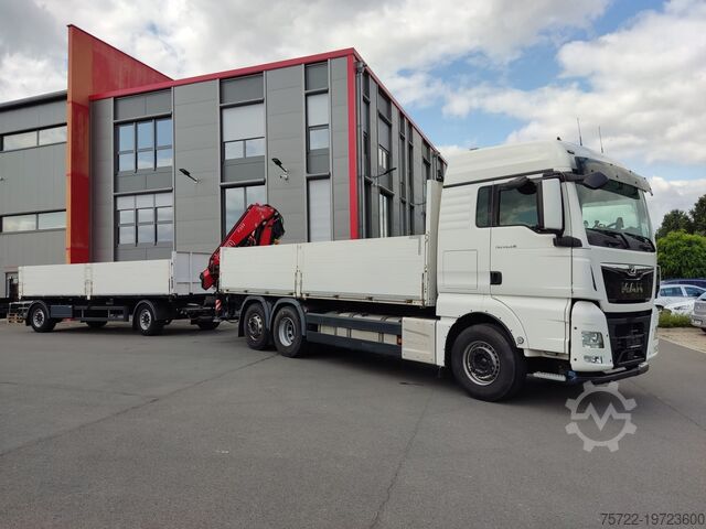 Used Vehicle MAN TGX 26.510 6x2-4 Flatbed with Fassi F235 A.2.26 (6-stage extension) and PAVIC 2-axle turntable construction trailer