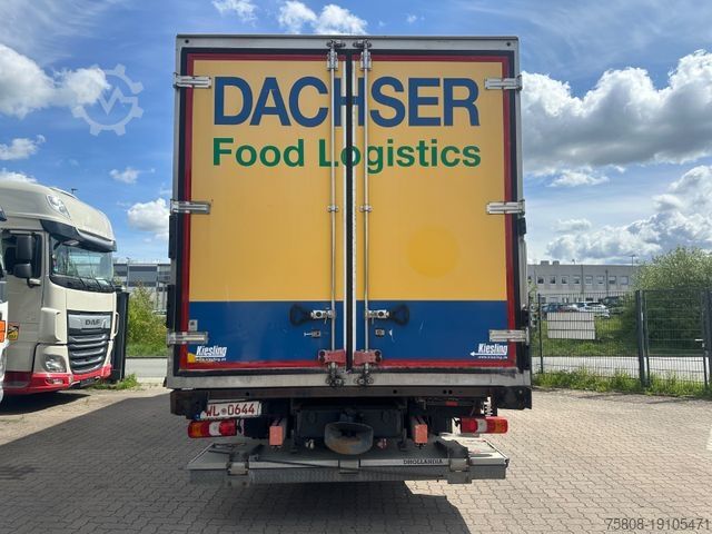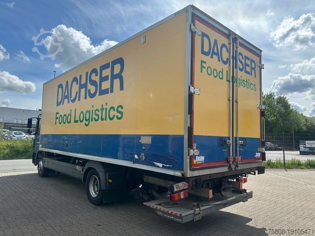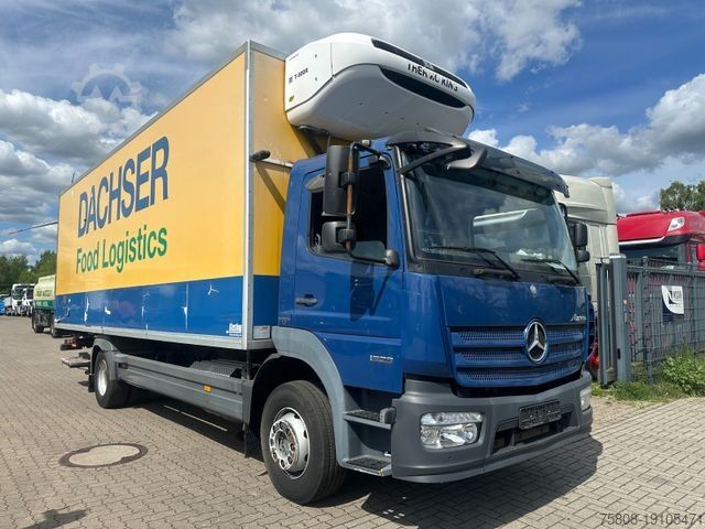 Mercedes-Benz Atego 1523 refrigerated box body, Kiesling body, 7.30 m, Thermoking T-800 engine, rated at -29°C, electric/diesel, approx. 14,100 hp, short-haul truck, leaf-air suspension, automatic transmission, Euro 6, lane departure warning, collision warning, cornering assistance, cruise control, Dhollandia tail lift, folded, maximum load capacity 1,500 kg, heated seats, trailer coupling, roof hatch, sun visor, radio/CD/AUX