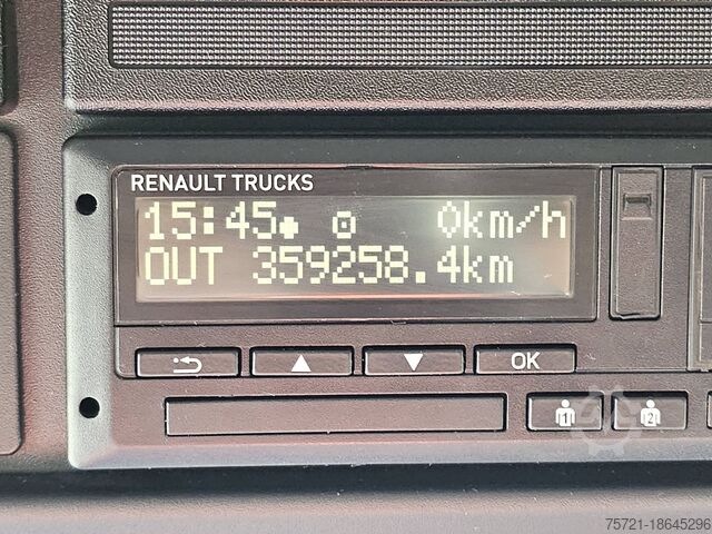 Number of axles: 2, Configuration: 4x2, Payload: 5223 kg, Own weight: 6767 kg, Gross weight: 11990 kg, Total tank capacity: 200 litres, Suspension type: Air suspension, Cabin type: Short cabin, Cruise control, Tachograph (control unit), Digital tachograph, Air conditioning, Color: White, Engine manufacturer: Renault, Engine power: 176 kW (236 Hp), Fuel: Diesel, Euro: 6, Gearbox type: Optidriver, Gears: 6, Power steering, ABS, ASR, Seats: 2, Tail lift, Tail lift type: Tailgate, Tail lift load capacity: 1500 kg, Tail lift manufacturer: Dhollandia, Tail lift material: Steel, Tail lift size: 175 x 252