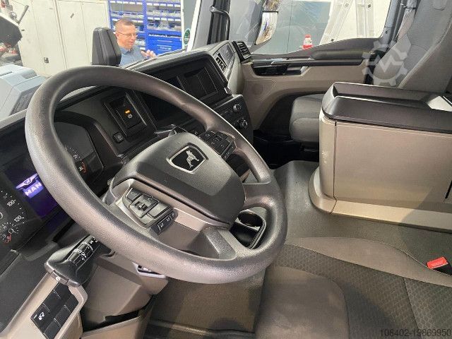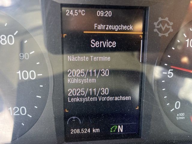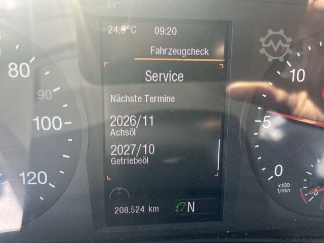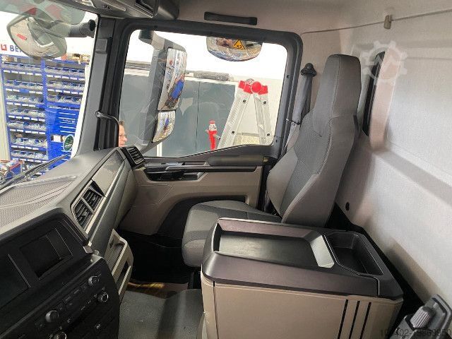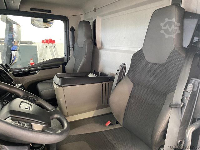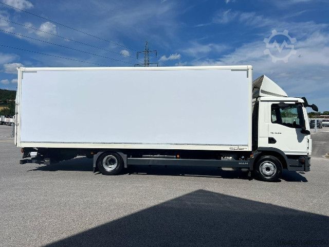 Cargo area (L x W x H): 7,100 mm x 2,480 mm x 2,400 mm, Tire size: 265/70 R17.5, Cargo area volume: 42 m³, 1st axle: , 2nd axle: , Leaf-air suspension, Tail lift, Tachograph, Electronic braking system (EBS), Electronic Stability Program (ESP), Traction control (ASR), Air-suspended driver’s seat, MAN Media Truck Advanced, Rear view camera, Adjustable steering column, Electric window lifters, Outside temperature display, Roof spoiler, Electric exterior mirrors, Kerb mirror, Sun visor, LED daytime running lights, Rubber floor covering. Subject to errors and changes.