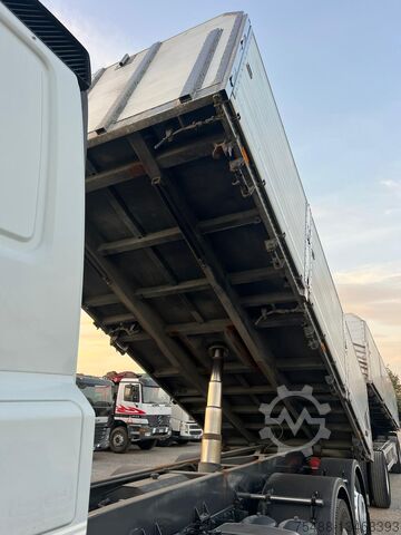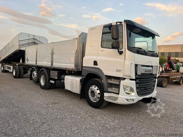 INFO ENG: Used truck DAF CF 460, 3-sided tipper, 3 axles 6X2, year 2016, long cabin with 1 bed, manual transmission ZF 16 gears, air conditioning, Webasto, engine brake, ABS, Euro 6, ADR, body length 6,200mm, wheelbase 4,200mm, total truck length 8,660mm, total weight 26,000Kg, capacity 14,770Kg, 1st axle leaf spring suspension, 2nd + 3rd axle air suspension, 3rd steering axle + liftable, alloy wheels, sun visor, 80% rubber, tire size 315/80 R 22.5, electric windows + mirrors, radio, Km 465,000, good condition.