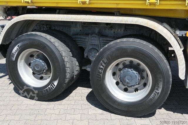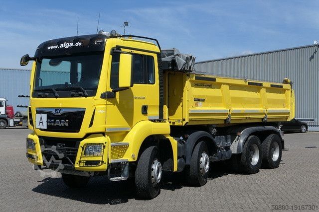 Кузов Meiller с трехсторонней разгрузкой, задний желоб 400 мм, Bordmatic, гидравлическая противоподкатная защита. складная, сдвижная крыша, электропривод. Привод, ZF - Intarder, MAN BrakeMatic, ABS, блокировка дифференциалов, помощь при трогании на подъеме, круиз-контроль, автоматический климат-контроль, многофункциональное рулевое колесо, радио с 7-дюймовым цветным дисплеем, Bluetooth, навигационная система, камера заднего вида (активируется при включении задней передачи), дополнительная камера за кабиной водителя, наружные зеркала заднего вида с подогревом и электроприводом. регулируемые электрические стеклоподъемники для дверей водителя и пассажира, люк на крыше, холодильник, комфортное сиденье водителя с подвеской, 2 проблесковых маячка, противотуманные фары, защитные решетки для фар, пневматические гудки на крыше кабины водителя, выключатель массы, приподнятая выхлопная система, листовые рессоры, алюминиевые диски ALCOA, алюминиевый бак площадью ок. 390 литров, транспортное средство может быть покрыто рекламой и/или наклеено