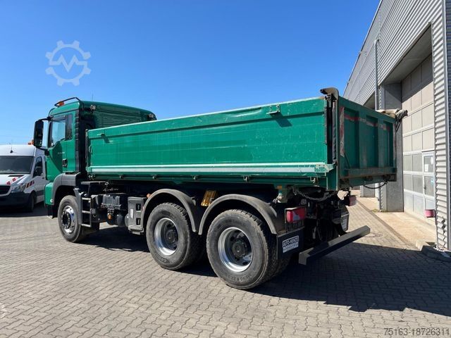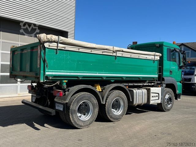 ----Body: Kempf 3-way pallet tipping body type KAB 24, steel front wall with excavator protection, aluminum side walls left and right (left with shock absorber relief, swinging and foldable), steel rear wall, steel floor, tie-down eyes, roll-up tarpaulin.----Vehicle is serviced according to the service book, last service performed by MAN at 237,000 km!