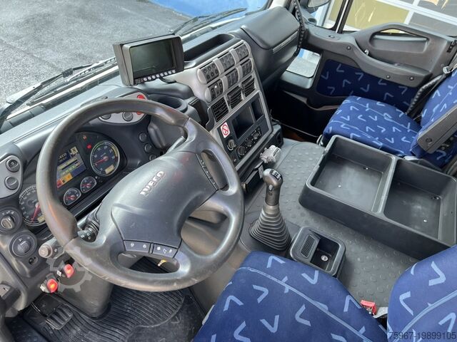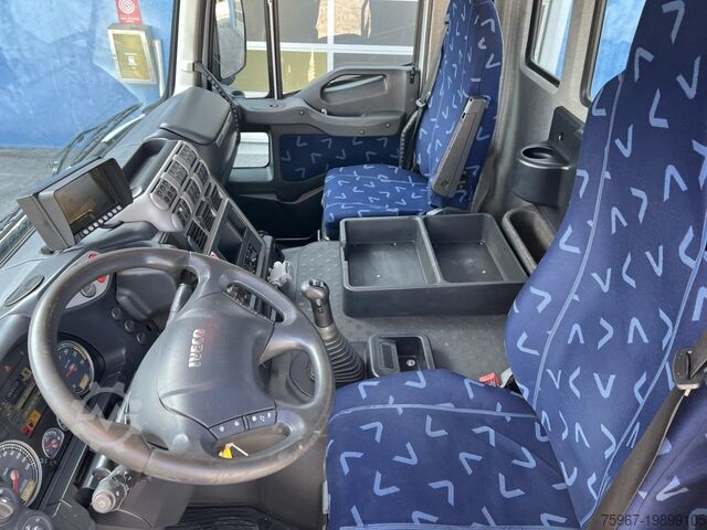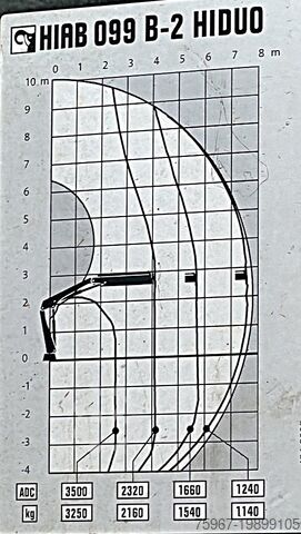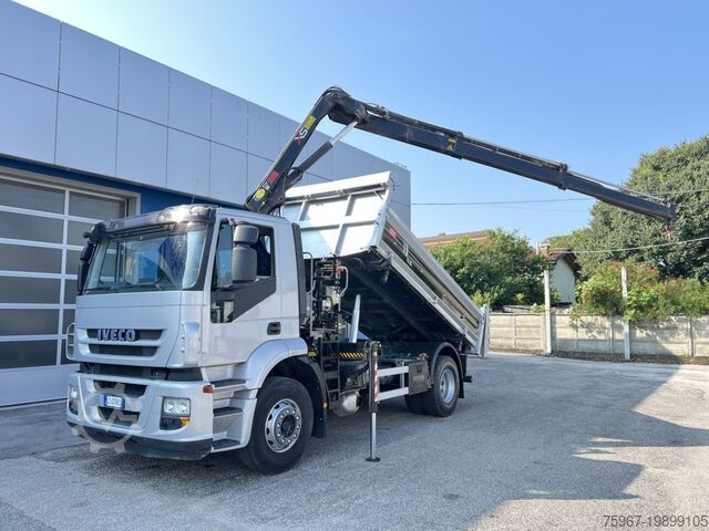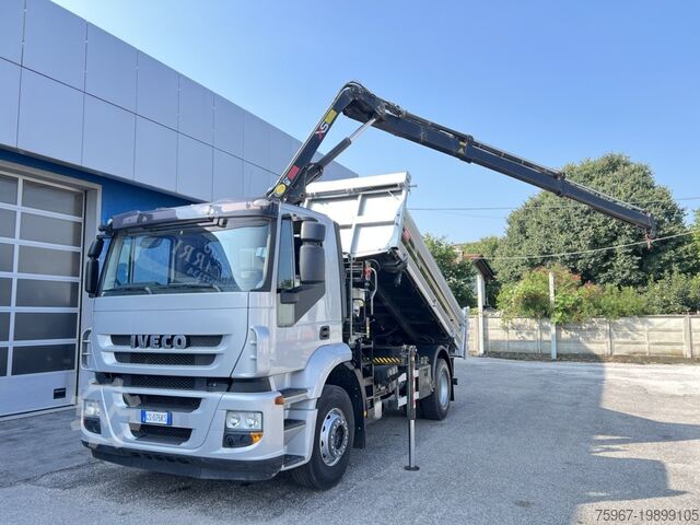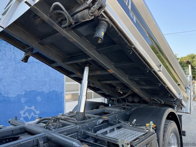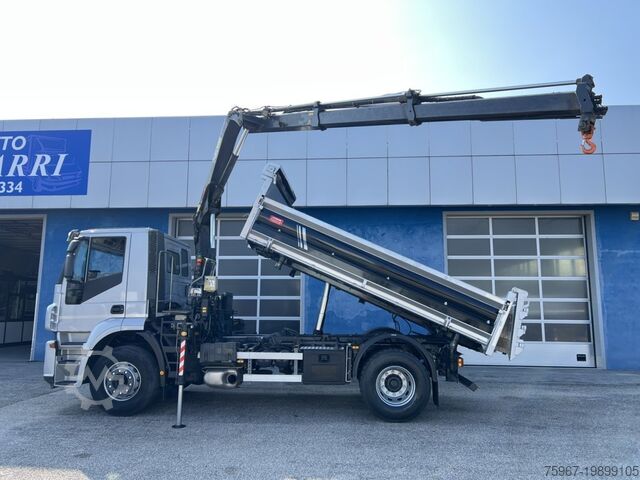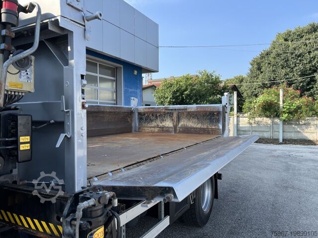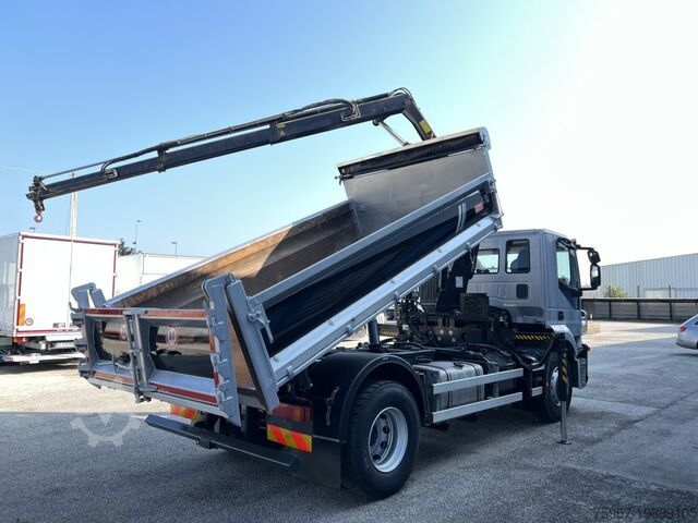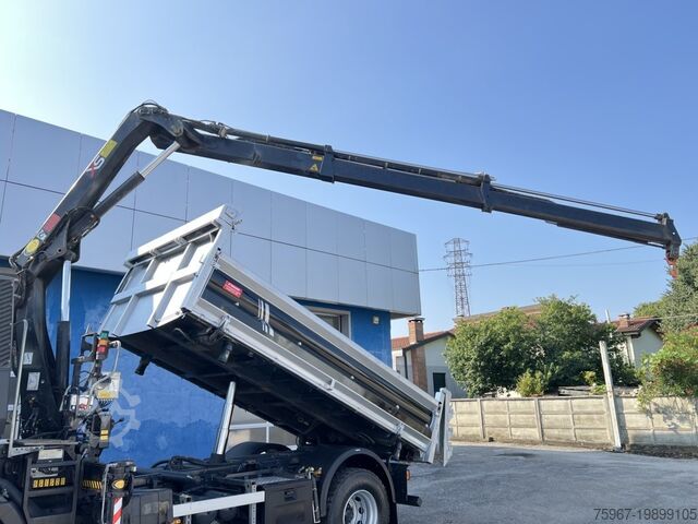 2-axle truck, 18t gross vehicle weight, equipped with a 3-way tipper body measuring 4.40x2.50m, sideboard with hydraulic opening, rear gate with double opening, tarpaulin cover, payload 7,450kg, Hiab series 099 crane with 2 hydraulic extensions and hydraulic outlets at the tip for accessories, radio remote control, manual gearbox, trailer coupling, Euro 5 standard.