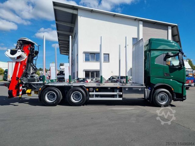 Iveco S-Way AS300X57 Z/P HR ON+ short timber truck, axle configuration 6X4 (with hydraulically driven front axle 6x6), external wheel drive tandem medium (HR), disc brakes, cab - active space version, large-capacity cab, air suspension rear axle, transmission shift 12-speed HiTroniX - automated, engine 570 C13 Cursor 13 570hp Euro VI, wheelbase 4800 mm, AS cab with high roof, cab roof insulation, electric lifting roof - transparent with MLL high roof, air suspension for cab, fog lights, halogen front headlights, electrically adjustable and heated mirrors, hybrid bumper, front underride guard, static passenger seat, one-piece lower bed, double thermal insulation box, EC digital 4.0, Electronic immobilizer and 2nd vehicle key, Luxury driver's seat - air suspension - heatable - 4-way adjustable - lumbar and head restraint with integrated 3-point safety belt, 2 torsion bar stabilizers HA reinforced, Moderate climate version, Exhaust tailpipe to left, Batteries 170 Ah, Batteries horizontal on frame, Rear spring without spacer, Generator 2160 watts (24 volts x 90 amps), Air compressor 2-cyl. 630 ccm, rear shock absorber, trailer socket for 24 volt operation - 15-pin, rear axle ratio: 4.23, Fuel pre-filter with separator - heatable, Adaptive cruise control (ACC), ECO-Switch - switching from power to eco mode to optimize the total cost of ownership (TCO) through consumption-optimized engine and transmission tuning, Driving style analysis (DSE), Transmission software ECO-Roll freewheel function, VDI interface (Vehicle Data Interface) for telematics services (FMS) - Version 3.0, preparation for toll system (OBU), preparation for telematics system (telematics box), Hill Holder, Electronic Stability Program (ESP), Lane Departure Warning System (LDWS), Emergency Brake Assist, HI-TRACTION, Rocking mode, luggage compartment left and right, tire inflation hose 15m, protective grille for headlights, fully automatic air conditioning, leather steering wheel with function buttons, sun blind, diesel/water auxiliary heating 4KW, front axle 8.000 kg / 1st rear axle 10,500 kg / 2nd rear axle 10,500 kg, Spare wheel, Reinforced anti-roll bar VA, Reinforced parabolic spring on the front axle, AdBlue tank 80 liters, Trailer coupling 50 mm 190 kN ring spring, Fuel tank 550 liters, CAN bus interface CAN-OPEN for body control, Infotainment system incl. navigation, Axle load indicator, Stopping indicator Navigation, axle load indicator, parking brake holding effect on the front axle, LED rear lights, retarder / intarder for ZF transmission, side marker lights, 385/65 R22.5 - 315/80 R22.5 tires, hybrid bumper painted in cab color, aluminium air reservoir, horn behind bumper, transparent sun visor,