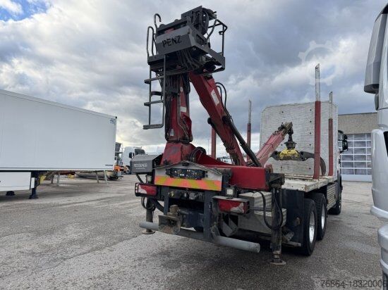 | Scania G490 6x6 timber transporter | Penz crane 12Z 8.70 | 2 pairs of stanchions | Automatic, EURO6, air conditioning | Cruise control, heated seats, auxiliary heating | Radio | Empty weight 15940kg | Loading length 5.5m to the crane 5.95m | 50mm AHV | Wheelbase 3900/1355 | Errors and pre-sales reserved
