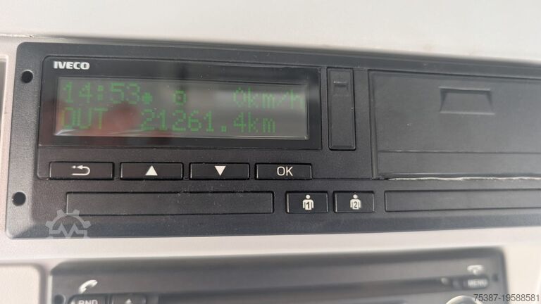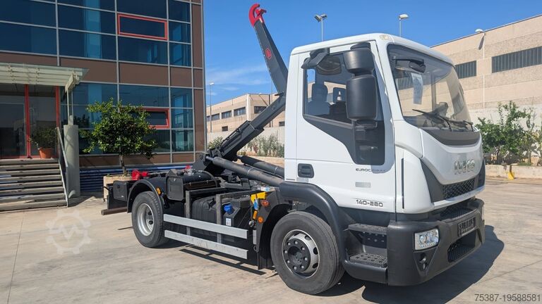 IVECO 140E28, Year 2019, Euro 6, white color, 21,260 km, wheelbase 3105 mm, ZF automatic transmission, differential lock, air conditioning, rear view camera, premium driver seat, towing capacity, fully equipped, fitted with new MEC hooklift system for 14 tons with vertical roller, hydraulic container locking, and hydraulic system prepared for crane box.