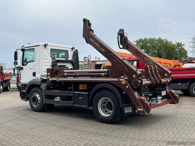 ----Bodywork: Meiller skip loader AK 12 MT, telescopic, 13,000 kg lifting capacity, radio remote control, hydraulic side container clamping device, rear hydraulic container locking, lashing points.