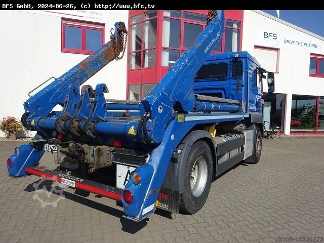 Automatic lowering, BKE+ CV comfort and rapid traverse, 3-way tipping hook, conversion to ISAR 2.5 (05.25) ESS, EBA2, ASR, construction access, mechanical lifting roof, MAN BRAKEMatic, entry lighting on driver and passenger side, grilled rear view window, air-suspended driver's comfort seat, sun blind on driver's door, STABO XM 3044 radio, mechanical lifting roof, ROCKINGER 400G150A cool box, ROCKINGER 400G150A trailer coupling, high-load roll stabilization, control module for external data exchange (KSM), 2 rotating beacons on the FH roof, AUX-in / USB in the dashboard, MAN Media Truck 12V radio with 7" color display, Rio Box AK 12 MT with container clamping device on the side + container locking at the rear, Isarcontrol, container locking at the rear, load-dependent rapid traverse, automatic lowering (sequence control), 3-way tipping hook, rear access with grab bar, I.S.A.R.-Control 2, power box