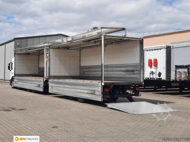 ----Böhm swing-wall box trailer in roof design with 4 load securing rails under the roof and in the cargo area floor with locking bars (longitudinally adjustable and foldable). Electric cargo area heater (220 V connection). Transport box for electric pallet trucks, additional trailer coupling for normal coupling height. Sold only with Böhm tandem trailer, first registered 08/2018, cargo area dimensions 7,310 x 2,450 x 2,390 mm, Palfinger tail lift, 2,000 kg, 1st axle liftable, our no. 504007. Trailer is included in the price of the towing vehicle.