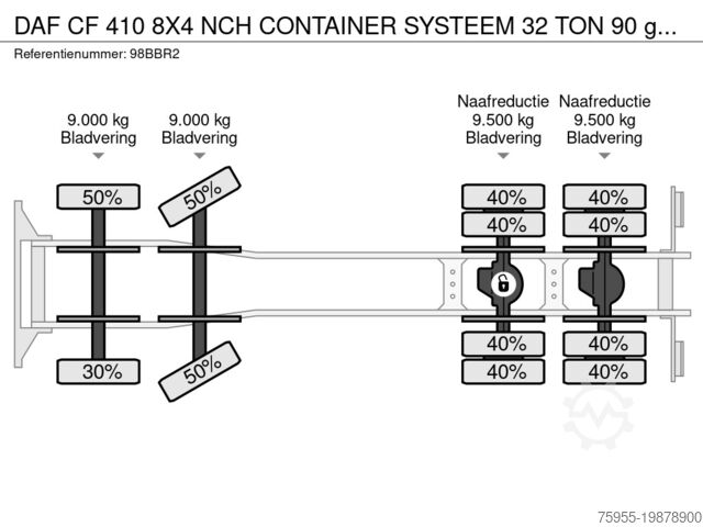 Rear axle 2: Twin tyres; Max. axle load: 9,500 kg; Left inner tyre tread: 40%; Left outer tyre tread: 40%; Right inner tyre tread: 40%; Right outer tyre tread: 40%; Gear reduction: External planetary axles