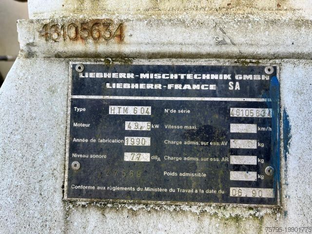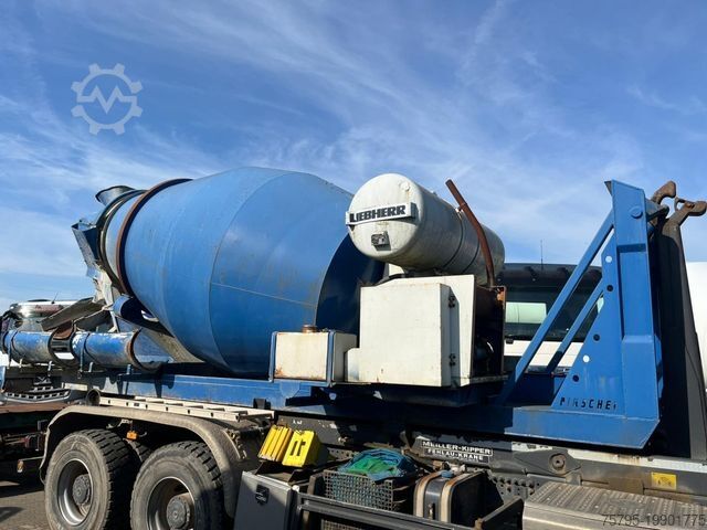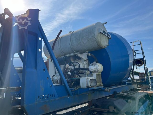 Body: Pirschel roll-off container chassis (total length approx. 6,700 mm) with Liebherr concrete mixer HTM 604, capacity 6,000 l, Liebherr 650 l water tank, separate Deutz F4L 912 engine, 4-cylinder diesel / 49.5 kW. Recorded operating hours: 12,546 h.