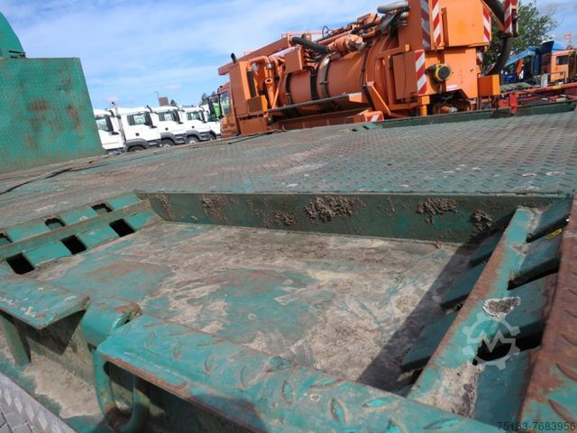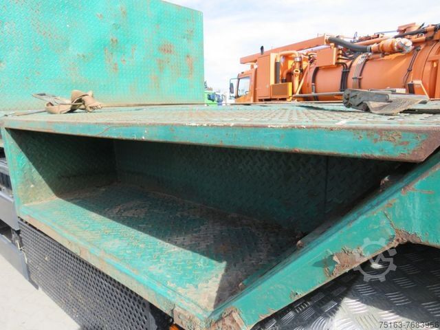 ----Construction: Roll-off container platform with 4 wheel recesses for transporting special machines, wheel recesses at the front (length 1,450, depth 600, height 480 mm), lashing eyes + lashing rings, rear flap can be folded down + removed.----Other data and year of manufacture not known as there is no type plate!