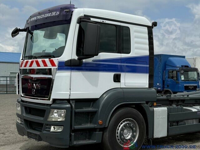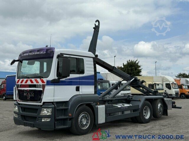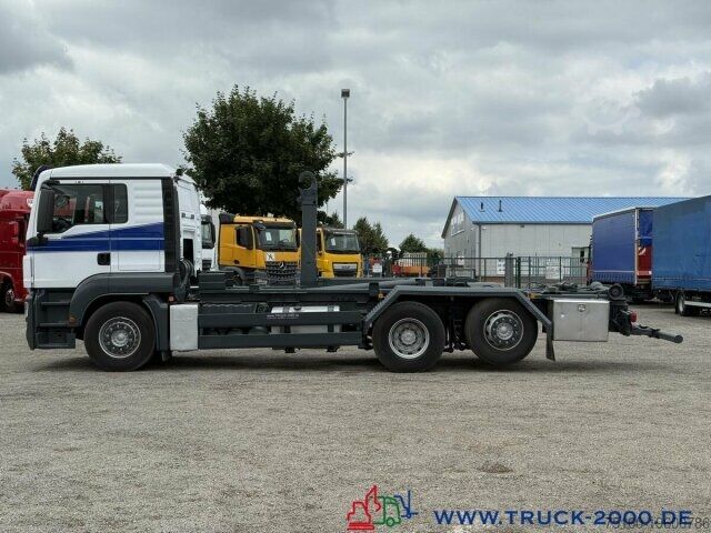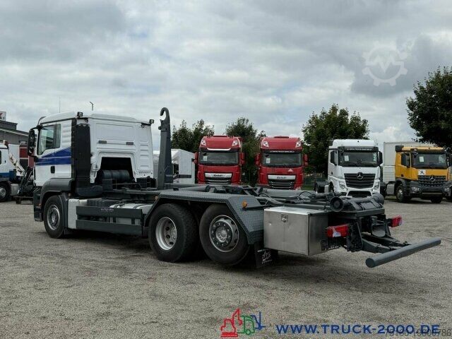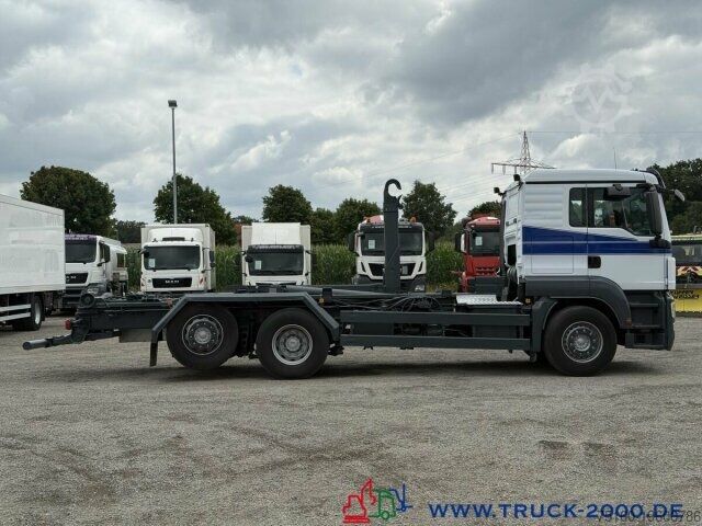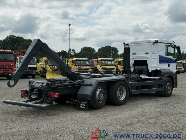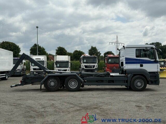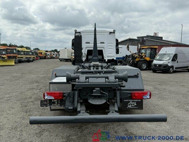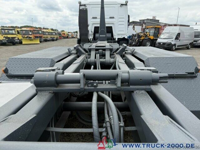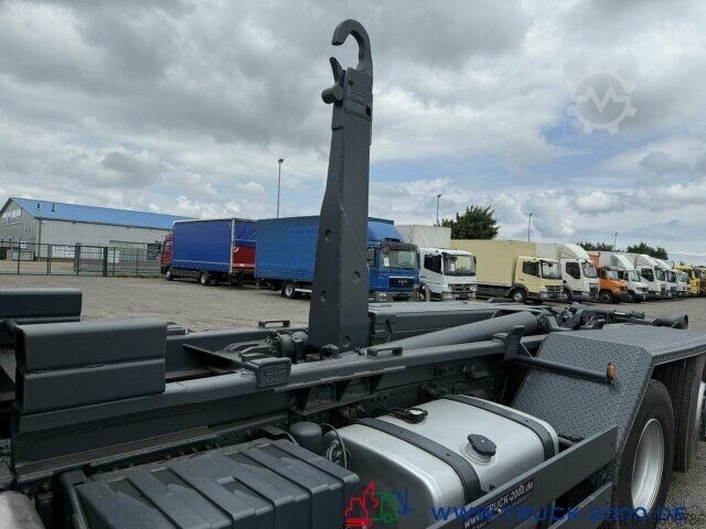 German vehicle, condition as per photos, Palift roll-off hook, suitable for all containers up to 7 m, pneumatic locking, extendable underrun protection, trailer coupling, towing capacity 24,000 kg, storage box, air suspension with lift/lower function, liftable trailing steering axle, air-suspended driver’s cab, air conditioning, retarder, refrigerator, bed, auxiliary heating, multifunction steering wheel, cruise control, differential lock, 2 air-suspended comfort seats, seat heating, stereo CD, phone preparation/hands-free kit, electric windows, electrically adjustable and heated mirrors, roof hatch, sun visor, gross vehicle weight 26,000 kg, unladen weight 11,050 kg, payload 14,950 kg. If a new TÜV inspection is required, we will be happy to provide you with an offer from our partner workshops.