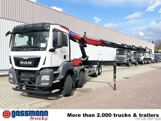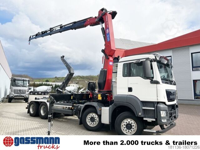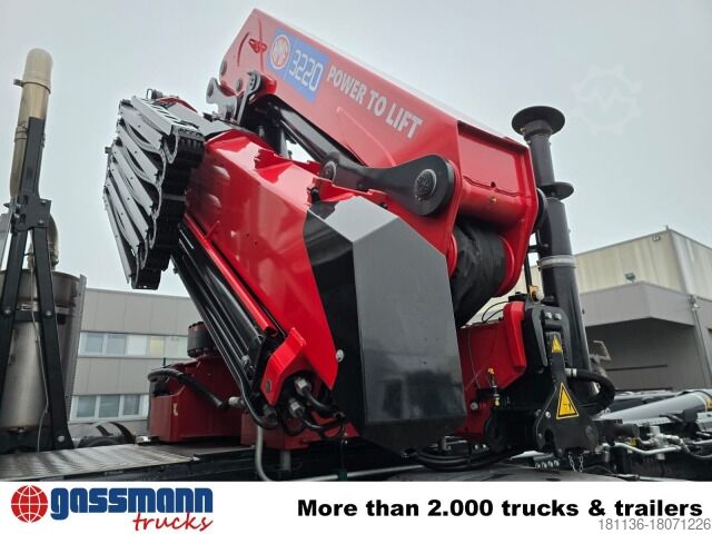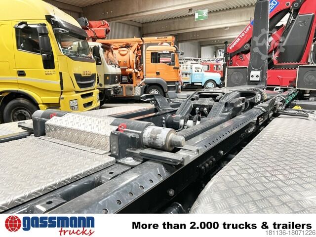 Vehicle location: Bovenden, Mtlg. Haus, 1x comfort seat, seat heating, rear window, electric mirror, heated mirror, electric window left, electric window right, air conditioning, sun visor, cruise control, air horn, ABS (anti-lock braking system), traction control (ASR), intarder, auxiliary drive, raised exhaust, AS-Tronic automatic, differential lock, fog lights, work lights, leaf air suspension, air + light connections for tow bar, aluminum tank, aluminum rims, 2 axles with pre-steering, U-protection, side aluminum underbody protection, hydraulic cross locking, roof hatch, crane behind house, emergency stop, grab control, foldable, 2-point hydraulic outriggers, radio remote control, 6x hydraulic. Extensions, green environmental sticker