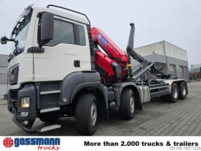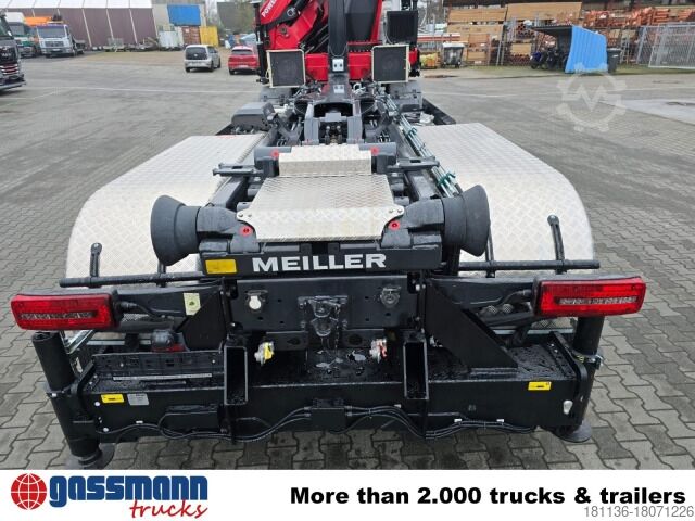 Wheelbase: 5900 mm Body: 21t Meiller RS 21.65 roll-off system for containers up to 6.5m (model 2022) & HMF 3220-K6 crane with quadruple outriggers & radio control (model 2022). New vehicle from stock with daily registration in February 2022!