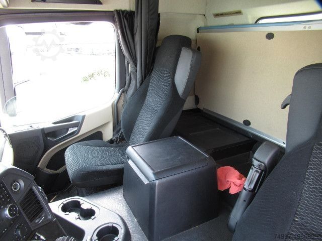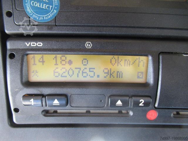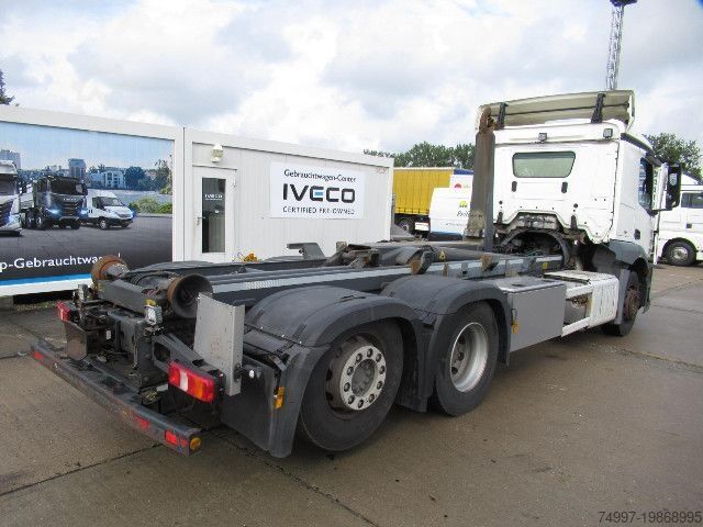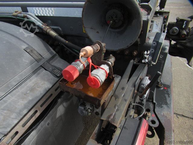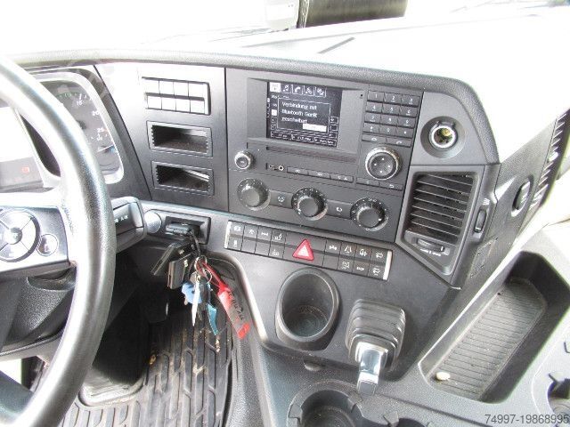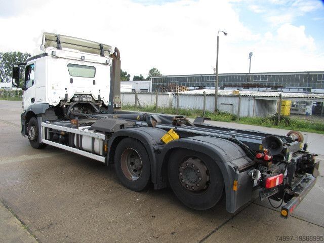 Body manufacturer: Meiller, unladen weight: 11,305 kg, gross vehicle weight: 26,000 kg, tire size: 315/70 R22.5, 1st axle: , 2nd axle: , 3rd axle: , steel-air suspension, lift axle steered, tachograph, pintle hook trailer coupling, traction control system (ASR), air-suspended driver's seat, electric window lifters, roof hatch, roof spoiler, electric exterior mirrors, central locking, rear differential lock, sun visor, central lubrication system, work lights, storage box, - Body: Meiller RK 20.65 hook lift, container length 6,500 mm - hydraulic connections for crane container - adjustable underrun protection - one previous owner - German vehicle - windshield is cracked - roadworthiness certificate (TÜV) valid until 11/2025, subject to errors and changes.