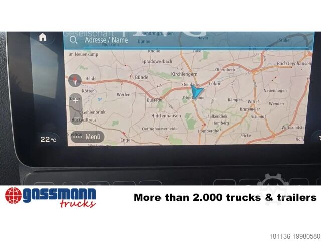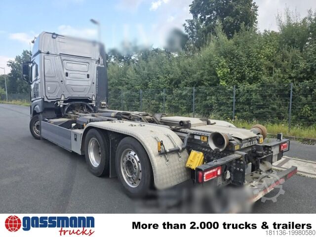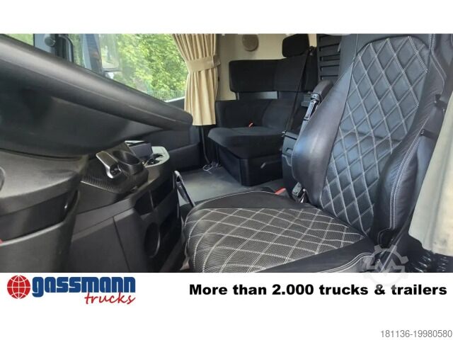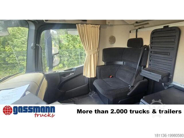 Vehicle location: in transit, GigaSpace, Active Brake Assist, Mercedes PowerShift 3, large cab, 1x comfort seat, 1x bunk, seat heating, electric mirrors, heated mirrors, left electric window, right electric window, air conditioning, sun visor, cruise control, navigation system, electric glass roof, auxiliary heater, air horn, ABS (anti-lock braking system), ASR (traction control), retarder, PTO (power take-off), chassis side panels, raise/lower function, differential lock, fog lights, high beam lights, work lights, storage box, air suspension, trailer coupling with air & electrics, aluminium tank, alloy wheels, rear axle liftable, rear axle hydraulic steering, underride guard, hydraulic transverse locking, remote control, green environmental badge.
