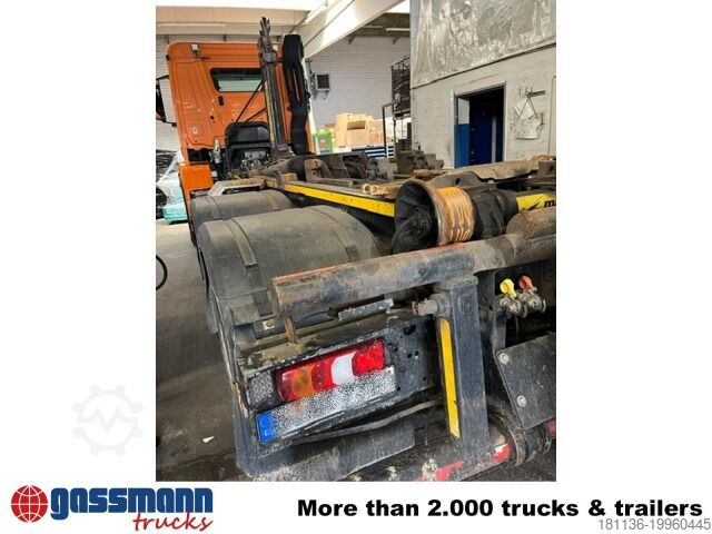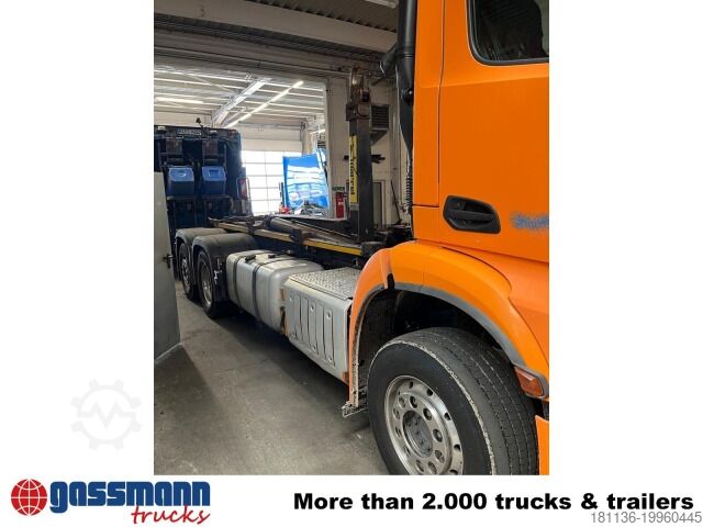Wheelbase: 4500 mm. Body: Marrel MA 26.70 hooklift system for containers up to 7m. Front axle 8.0 t, rear axle, crown wheel 485, hypoid, 13.0 t, trailing axle 9 t, steered, load-relieved, liftable. Disc brakes, front and rear axles. Driver and passenger air-sprung comfort seats, leather, high storage on engine tunnel. Cable remote control for air suspension. Illuminated Mercedes star. S-cab ClassicSpace, 2.30 m, 170 mm tunnel. Locking system with central locking, 2 keys. Mercedes PowerShift 3, transmission G 281-12/14.93-1.0. Instrument cluster, 12.7 cm with additional displays. Radio/navigation system Bluetooth®, comfort speaker, 2-way system. Tank 510 l, left, 650 x 700 x 1300 mm, aluminum. Bi-xenon headlights, headlamp cleaning system, fog lights, LED daytime running lights, LED rear lights. Engine OM473, R6, 15.6 l, 380 kW (517 hp), 2600 Nm, engine spec Euro VI, version 2. Engine brake, standard system NA MB 131-2c, pump, rear engine PTO, hydraulic pump ISO 7653D. Standard trailer coupling, D40, Ringfeder. Stability control assistant (ESP), lane keeping assistant, attention assistant, Active Brake Assist, cruise control.