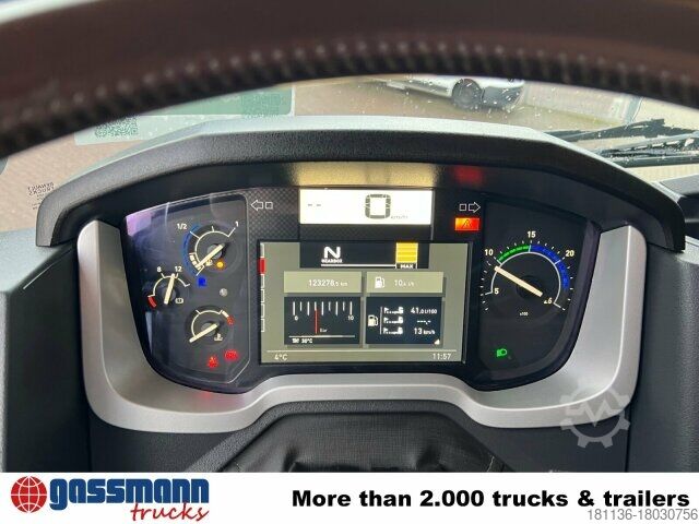 Vehicle location: Bovenden, Lg. House, 1x comfort seat, 1x couch, seat heating, electric mirror, heated mirror, electric window left, electric window right, air conditioning, sun visor, cruise control, auxiliary heating, air horn, ABS (anti-lock braking system), traction control (ASR), retarder, power take-off, exhaust raised, automatic, differential lock, fog lights, storage box, leaf-air suspension, air+light connections for trailer hitch, alu side skid plate, roof hatch, environmental badge green, green environmental badge for the vehicle. Aluminum side bumpers, roof hatch, green environmental badge