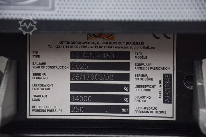 New truck with AJK 14 ton hook lift system (type HL 14N4480) – Air conditioning – MAN Brake Assist System – MAN Lane Departure Warning – Rockinger – Total weight 19,000 kg – Wheelbase 3875 mm.