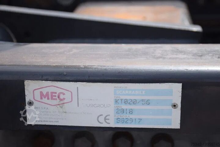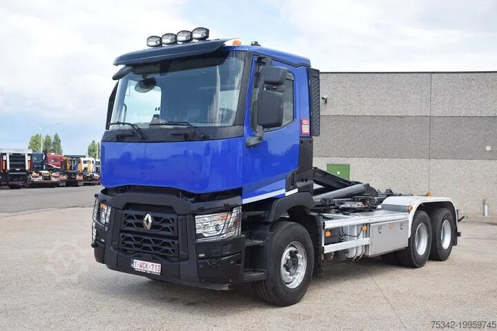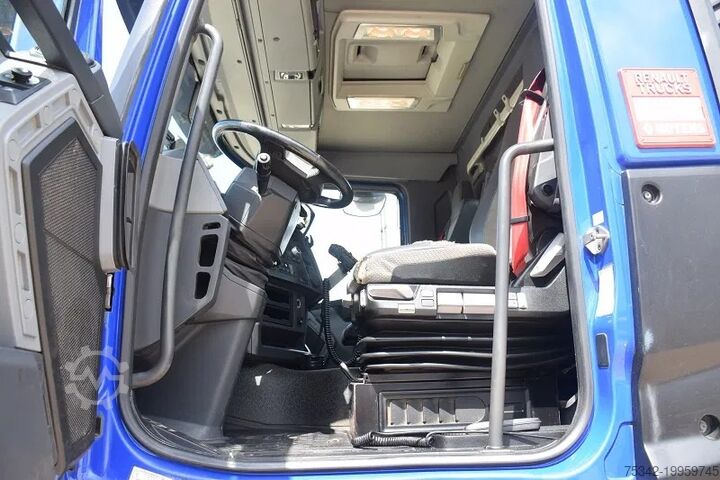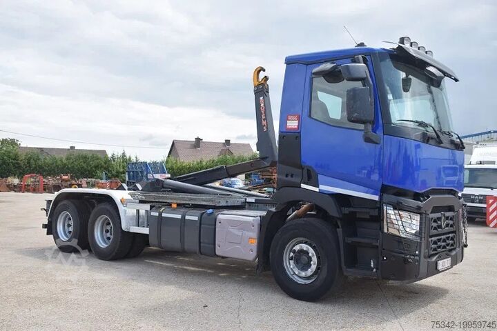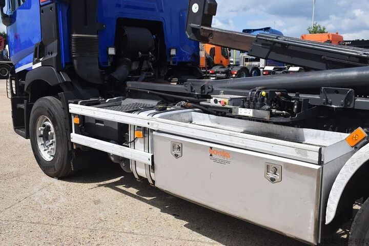 Used Renault truck equipped with a Busi Group MEC KT020/56 hooklift system. This truck features a towing axle, twin rear wheels, air conditioning, and a reinforced engine brake.