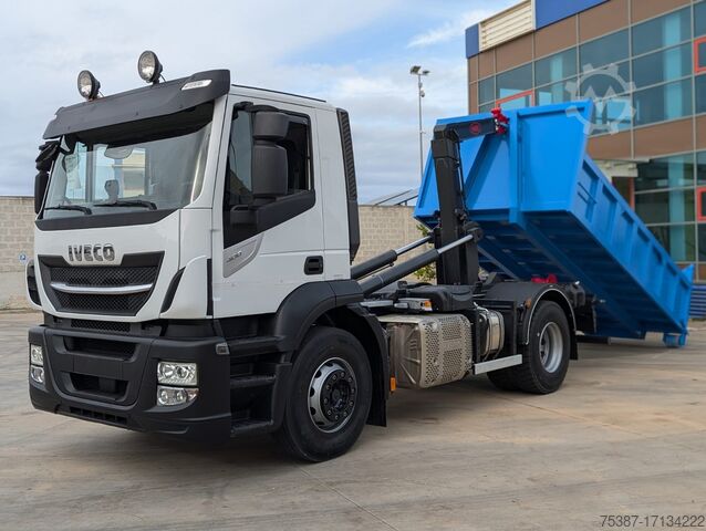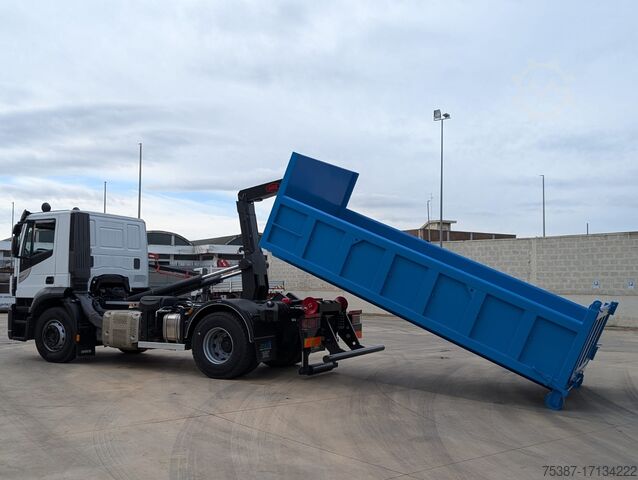 IVECO AT190.40, Short cabin, Low roof, Euro 6, Year 2018, White color, KM. 395,436, Wheelbase 3800, ZF 12-speed automatic transmission, PTO with power take-off, air conditioning, differential lock, 1st axle 8 tons, navigator, 80% rubberized, towable mass 26 tons, complete with new MEC 16-ton hook lift system, with vertical roller, hydraulic lock, hydraulic system for trailer and crane body