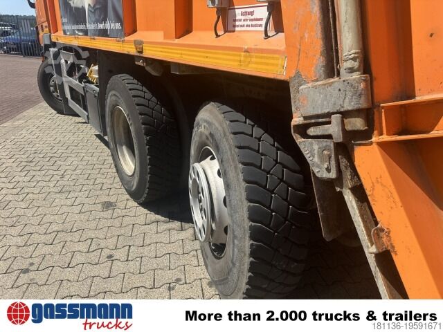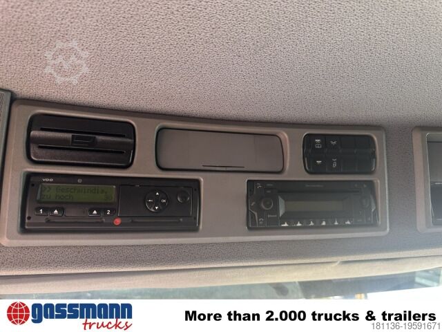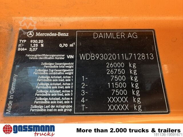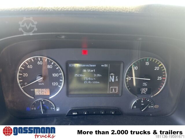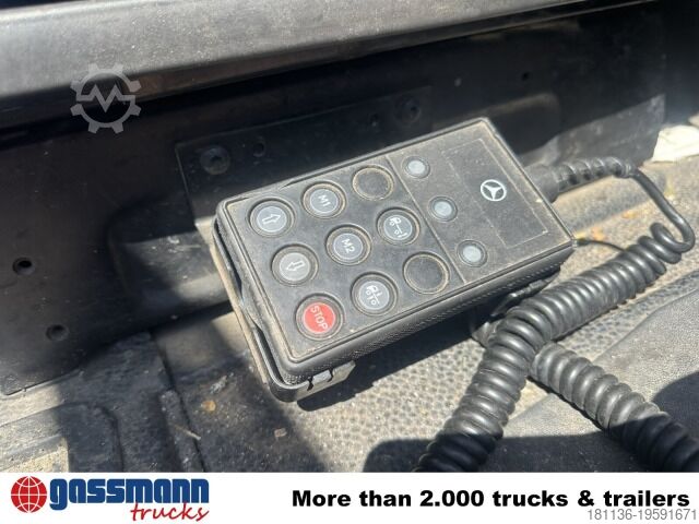 Vehicle location: Bovenden. Mercedes PowerShift II transmission, company-owned, 1x comfort seat, seat heating, electric mirrors, heated mirrors, electric window left, electric window right, air conditioning, cruise control, ABS (anti-lock braking system), traction control (ASR), constant throttle, PTO (power take-off), differential lock, fog lights, revolving beacon, storage box, leaf/air suspension, low-noise G1, rear axle with steering function, side aluminum underrun protection, roof hatch, green environmental badge.