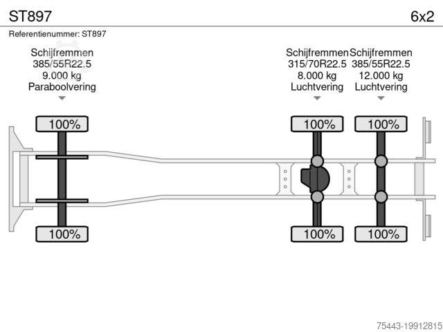 Rear axle 2: Tire size: 385/55R22.5; Max. axle load: 12,000 kg; Tire tread left: 100%; Tire tread right: 100%; Suspension: Air suspension