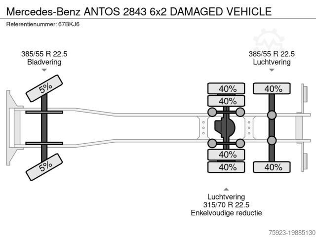 Rear axle 1: Tire size: 315/70 R 22.5; Twin tires; Left inner tread: 40%; Left outer tread: 40%; Right inner tread: 40%; Right outer tread: 40%; Reduction: single reduction; Suspension: air