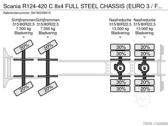 Rear axle 2: double tires; differential lock; Max. axle load: 13000 kg; Tire profile left inside: 20%; Tire profile left outside: 20%; Tire profile right inside: 20%; Tire profile right outside: 20%; Reduction: outer planetary axles; Brakes: drum brakes
