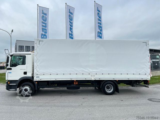As good as new MAN 15-ton flatbed tarpaulin truck with a 7.25-meter-long flatbed and DHollandia tail lift, 1,500 kg, 8.0-ton payload, 290 hp, 3-seater, air conditioning, rear axle with air suspension, trailer coupling, gross combination weight 33 tons. , cruise control, and much more.