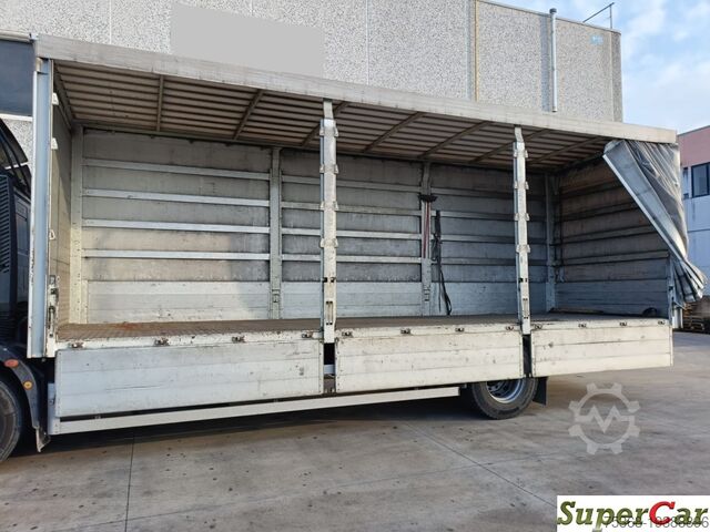EURO 3 – Wheelbase 5670 mm – Fixed tarpaulin body 8.20 x 2.55 x H 2.75 m – 9-speed manual gearbox – Short cab, 3 seats – Rear air suspension – Gross weight 18,000 kg – Payload 9,000 kg.