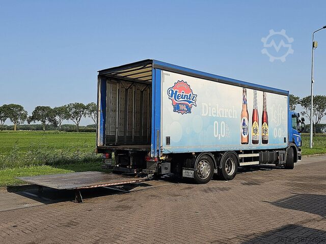 Number of axles: 3, Configuration: 6x2, Kerb weight: 11,420 kg, Gross weight: 26,124 kg, Total tank capacity: 450 liters, Number of locking differentials: 1, Cab type: Short cab, Cruise control, Tachograph (control device), Digital tachograph, Color: Blue, Lighting type: Halogen lamp, Speed limiter, Engine power: 265 kW (355 Hp), Fuel: Diesel, Euro: 5, Transmission type: Manual, Transmission make: Scania, Speed limiter, Gears: 8, Clutch pedal, Additional braking system, Retarder make: Scania, Power steering, ABS, ASR, Starter battery, Seating configuration: 1+1, Seat trim: Fabric, Manual seat adjustment, Tail lift, Tail lift version: Rear tailgate, Tail lift capacity: 2,500 kg, Tail lift manufacturer: Dhollandia DHLSU.40, Tail lift material: Steel, Tail lift dimensions: 240 x 251, 2,500 kg lift