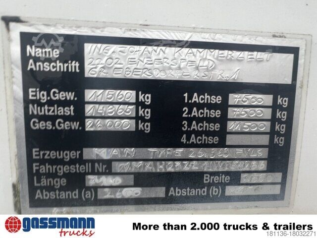 Wheelbase: 3950 mm Body: Skip system Hüfferman ASK 18, engine: D2866LF27, transmission: 16S1820TO, front axle 1: VOK-08-03, rear axle 1: HY-135003, cab: M, leading axle 3: LOL-08-03. ACCESSORIES WITHOUT WARRANTY, subject to alterations, prior sale and errors excepted!