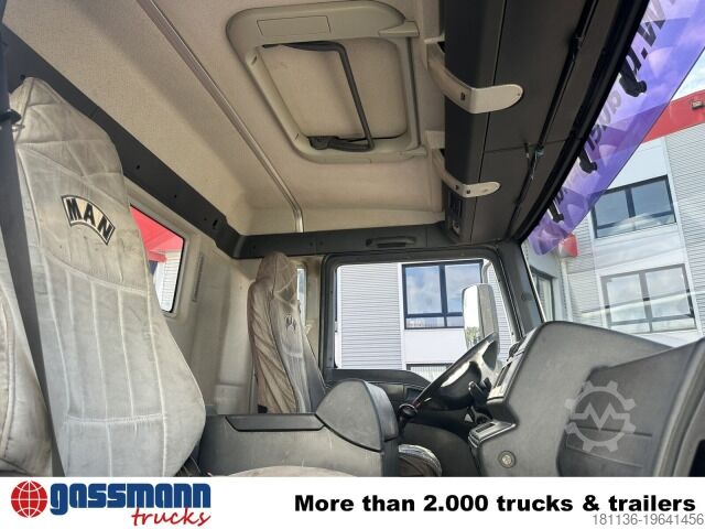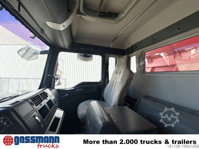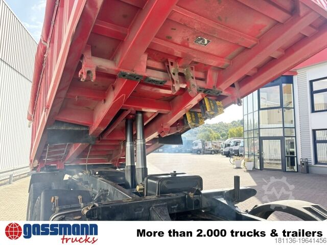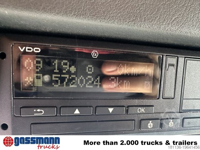 Vehicle location: Bovenden, steel body, equipment house, 1x air-suspended seat, rear window, electric mirrors, heated mirrors, electric window left, electric window right, sun visor, cruise control, 16-speed manual gearbox, ABS (anti-lock braking system), traction control (ASR), constant throttle, power take-off, central lubrication system, differential lock, fog lights, leaf suspension, low-noise G1, roller tarpaulin, underride guard, chute, roof hatch, green environmental badge. Wheelbase: 4300 mm. Body: Meiller three-way tipper body with roller tarpaulin. ACCESSORY DETAILS WITHOUT GUARANTEE. Subject to change, prior sale, and errors!