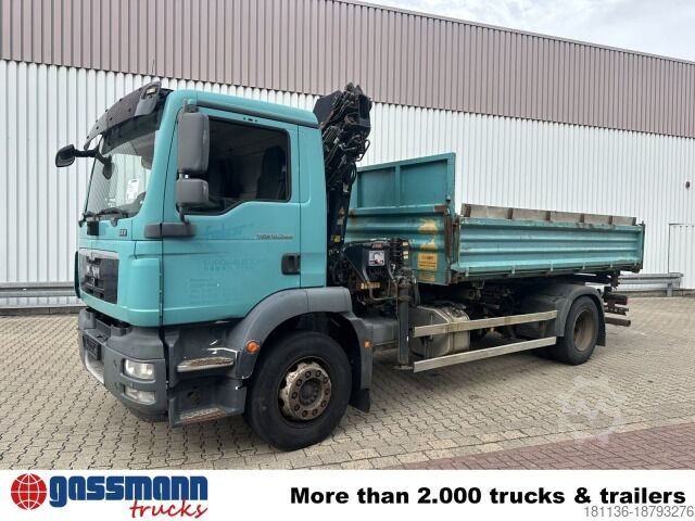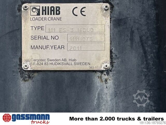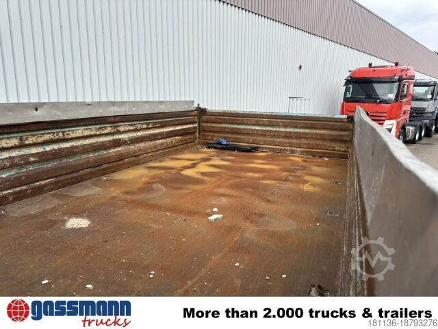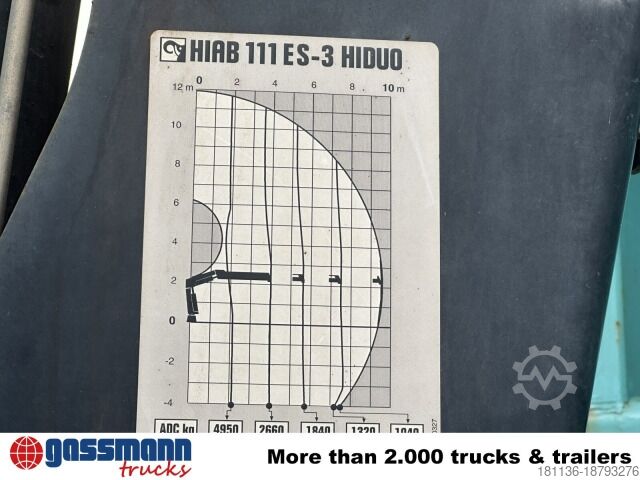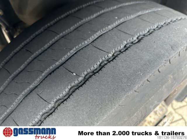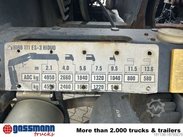 Vehicle location: Bovenden, steel body, 1x air seat, electric mirror, heated mirror, left electric window, right electric window, air conditioning, sun visor, cruise control, ABS (anti-lock braking system), traction control (ASR), constant throttle, auxiliary drive, AS-Tronic automatic, lifting and lowering, differential lock, fog lights, work lights, storage box, air suspension, air-light-hydraulic tow bar, low-noise G1, lashing eyes, underbody protection, side aluminum underbody protection, pendulum flaps, crane behind the house, emergency stop, grab control, foldable, 2-point hydraulic outriggers, radio remote control, 3x hydraulic extensions, green environmental sticker