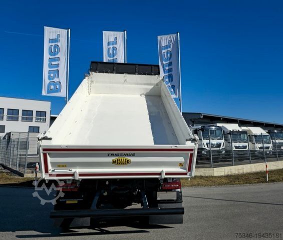 New vehicle 18 t. MAN TGM 18.320 truck with Meiller 3-way Trigenius tipper, 320 HP, automatic transmission, high-performance engine brake, EVBec, trailer coupler with air and hydraulic connections for tipping trailer, automatic climate control, tire pressure monitoring system, reversing camera, navigation system, Driver’s Seat Package Plus, central locking with remote control, and much more.