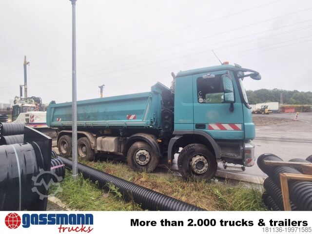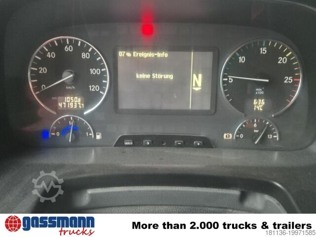 Wheelbase: 4,500 mm. Body: Meiller 3-way tipper body with Bordmatik (left), 7.5t front axle, rear axle H7 13t, crown wheel 233, disc brakes with full protection on front and rear axles, Telligent brake system with ABS and ASR (ABS can be deactivated), rear axle stabilizer, steel bumper, PSM, prepared for toll registration, distributor cockpit, Telligent gearbox II, additional warm air heater Webasto Air Top 2000, construction site filter, onboard diagnostic 2, tandem air filter system, protective plate under radiator and engine, Meiller 9-piston pump type 295, M-Jet 4mm sideboards, PTO transmission shaft MB 131-2c.