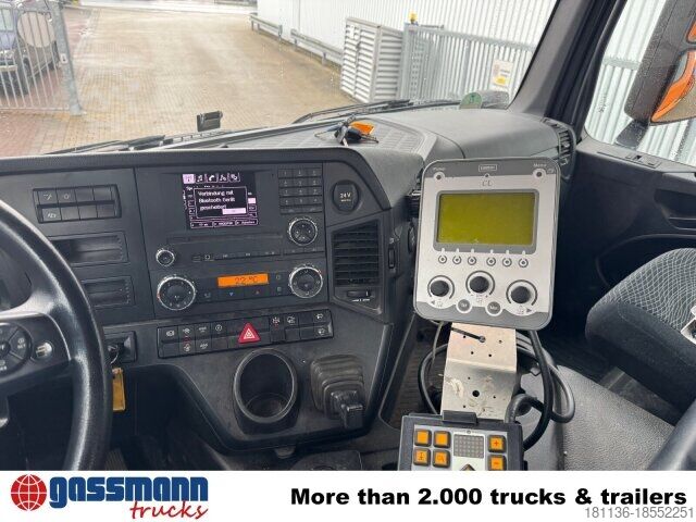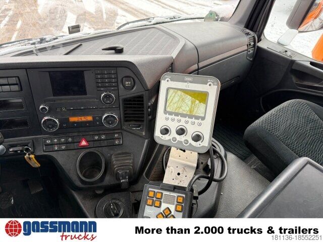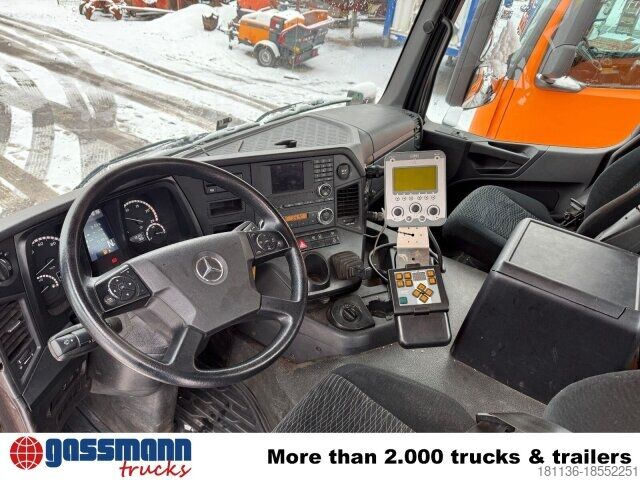 Vehicle location: Bovenden, ClassicSpace, Mercedes PowerShift 3, steel body, with company building, 1x comfort seat, seat heating, rear window, electric mirrors, heated mirrors, left electric window, right electric window, air conditioning, sun visor, cruise control, auxiliary heater, ABS (anti-lock braking system), constant throttle, power take-off, raised exhaust, differential lock, fog lights, high beam headlights, rotating beacon, storage box, leaf suspension, Bordmatik on the left side, trailer hitch with air-light-hydraulics, winter service equipment, lashing eyes, underrun protection, roof hatch, green environmental badge.